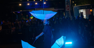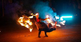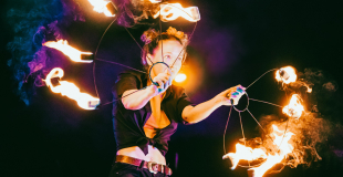 Lors du spectacle nous proposons comme performance les portés acrobatiques, aérien, cerf volant géant, jongle de feu et de parapluie.