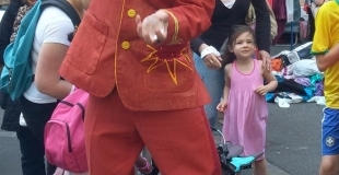 D'un côté un jongleur et sa valise magique qui sort tantôt des boules de pétanques, des massues et des boules de cristal et fait participer toute la famille.