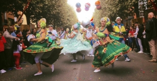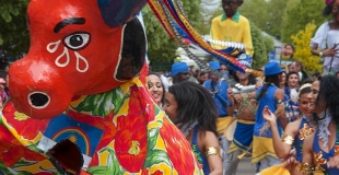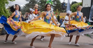 BATUK NAGÔ propose des déambulations composées de percussionnistes, de danseuses et de personnages du Nordeste du Brésil que les enfants adorent.